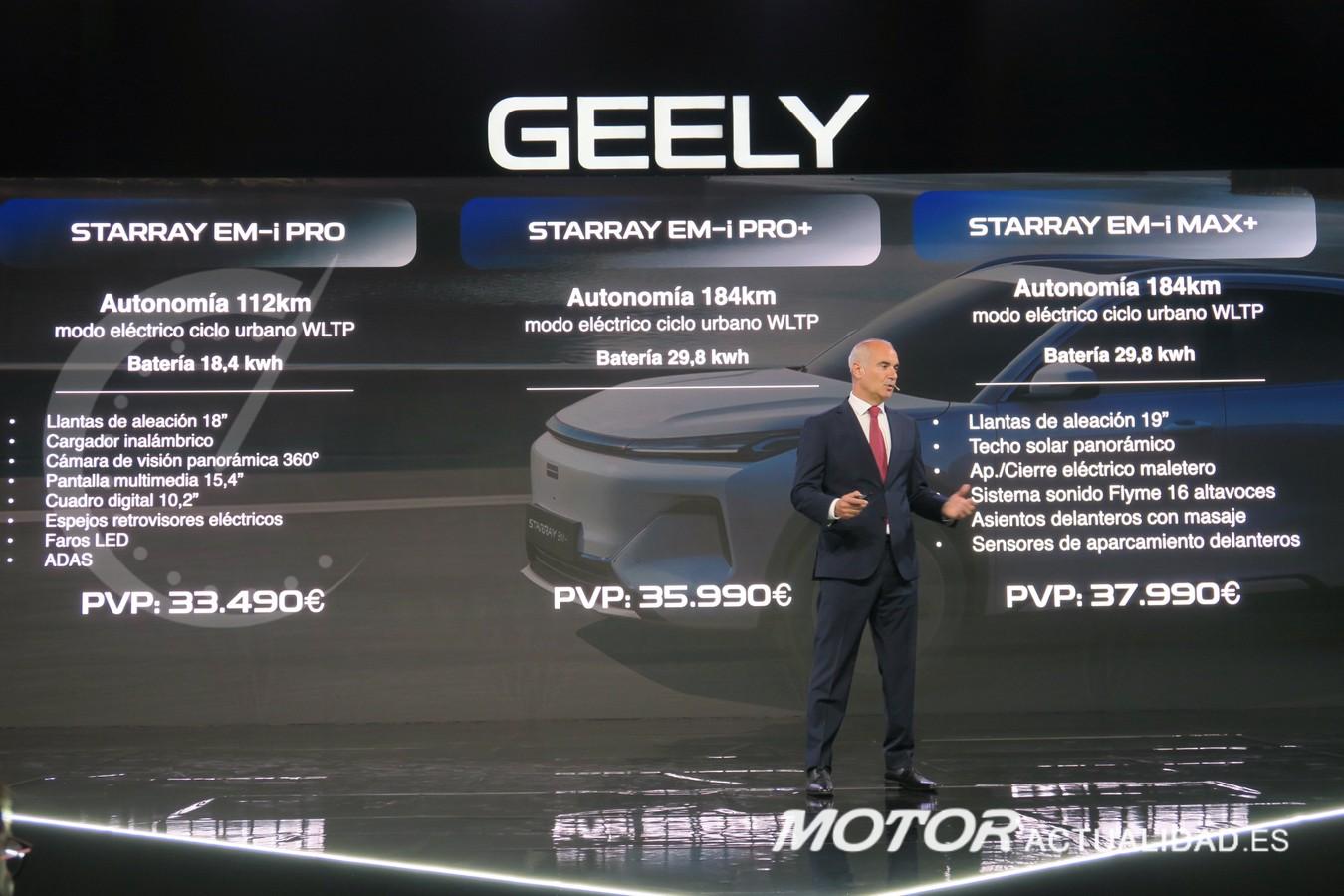 La gama Starray EM-i en España se estructurará en tres acabados: PRO, asociado a la batería de 18,4 kWh; y PRO+ y MAX+, ligados a la batería de 29,8 kWh. Los precios de tarifa recomendados son los siguientes: